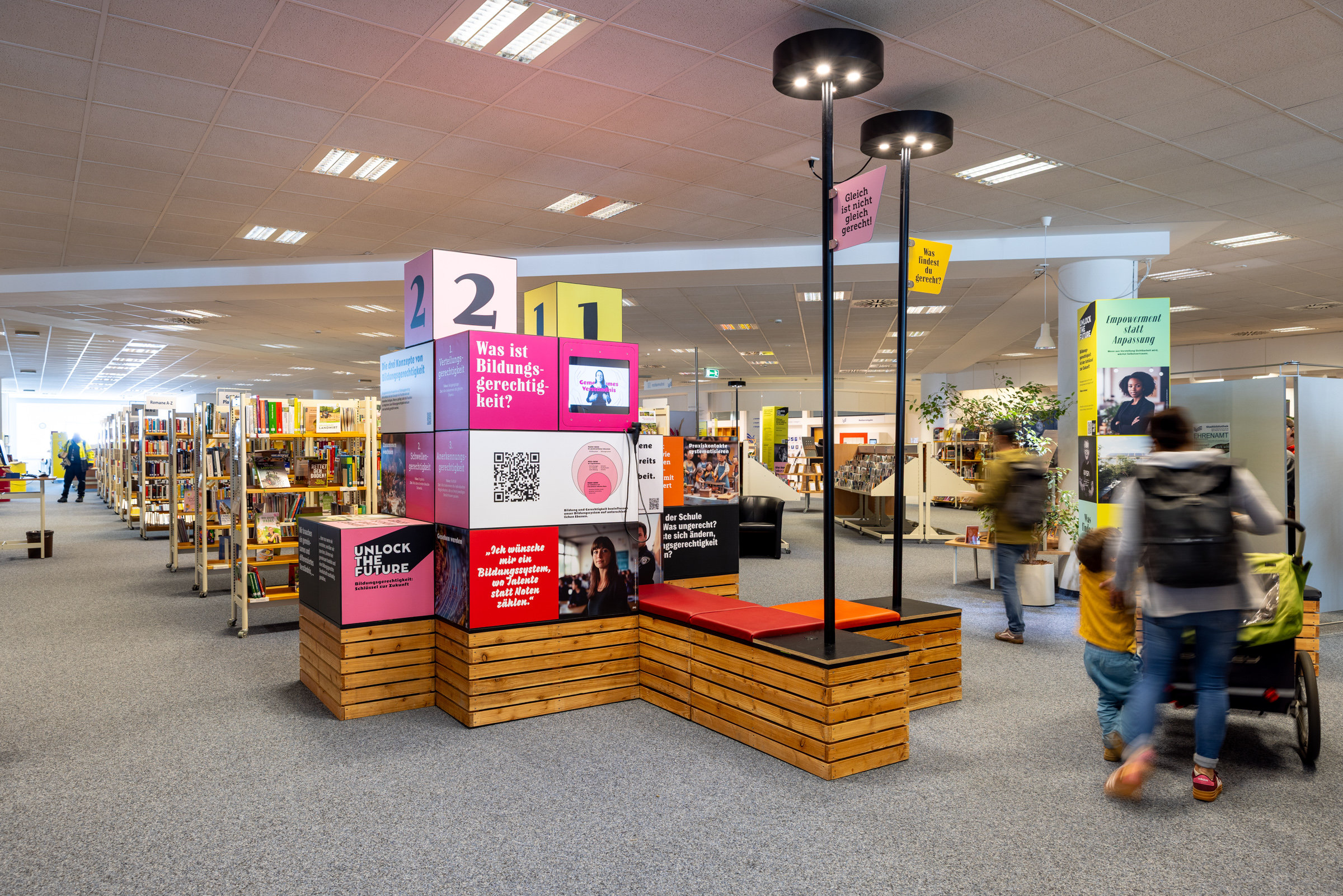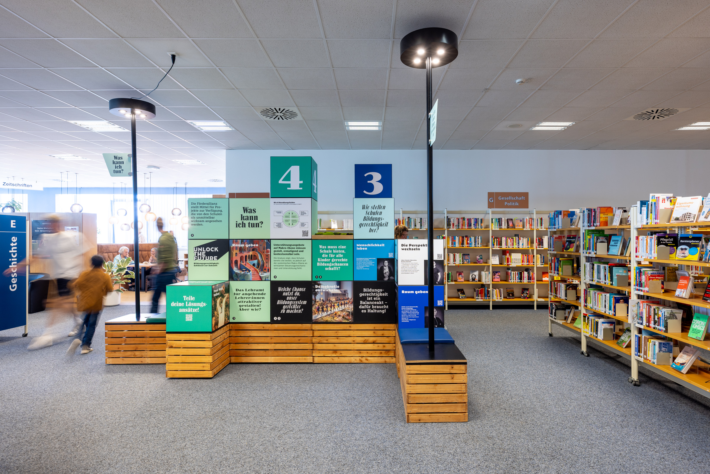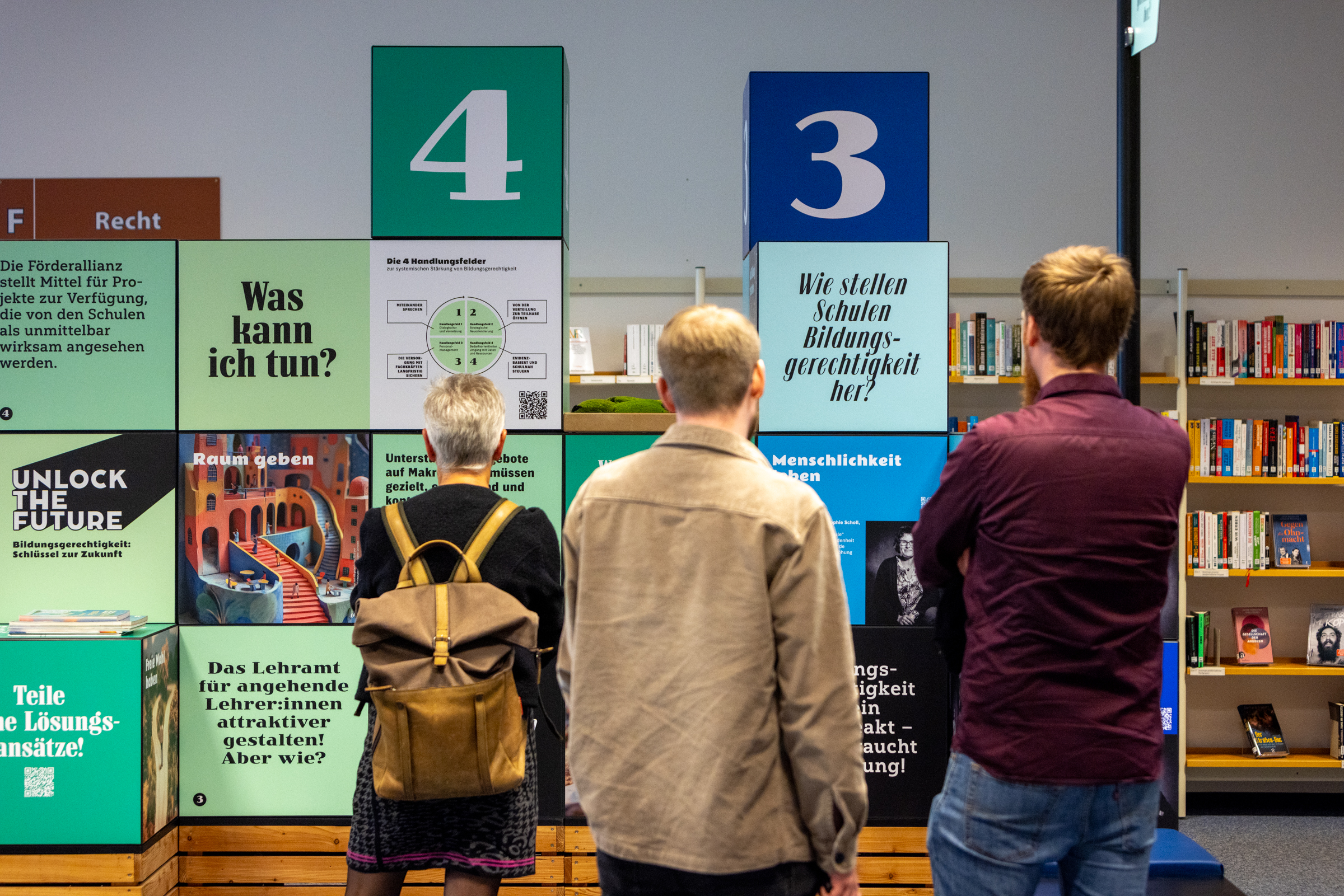 Besucher:innen erkunden in der Ausstellung innovative Perspektiven, bewährte Lösungen und inspirierende Best Practices zum Thema Bildungsgerechtigkeit.
