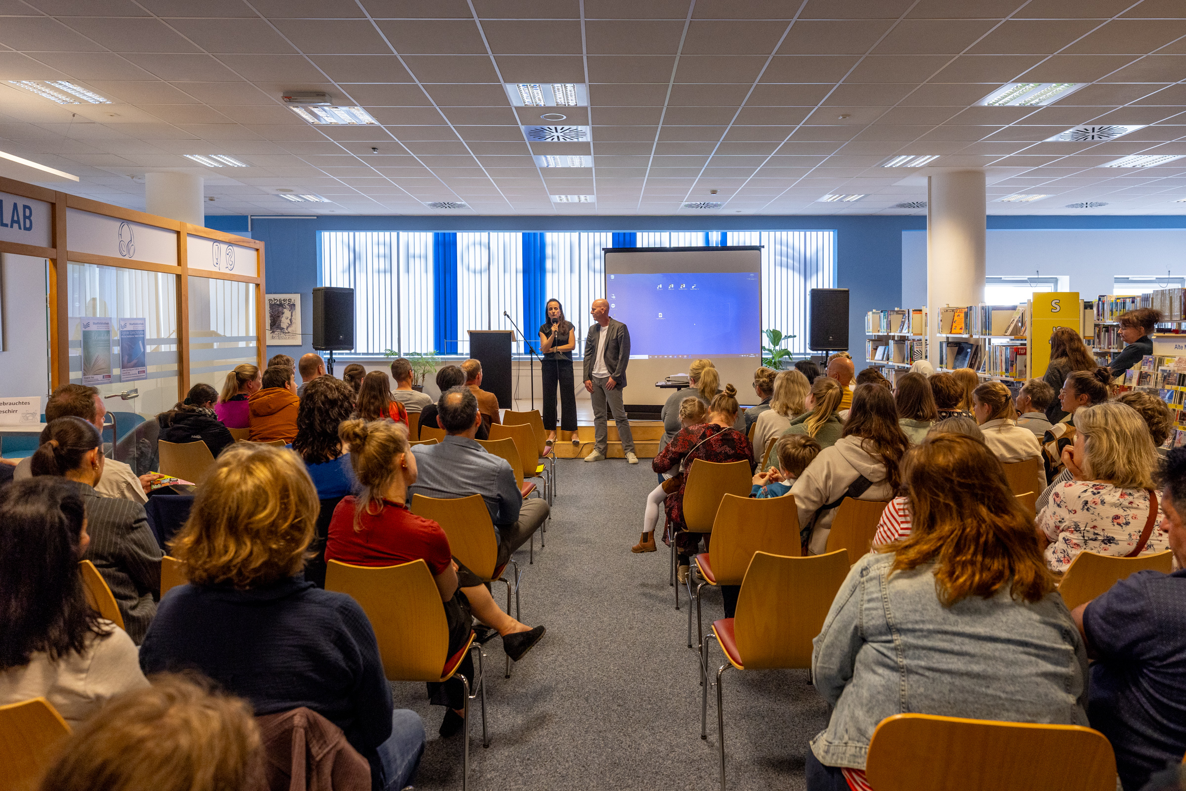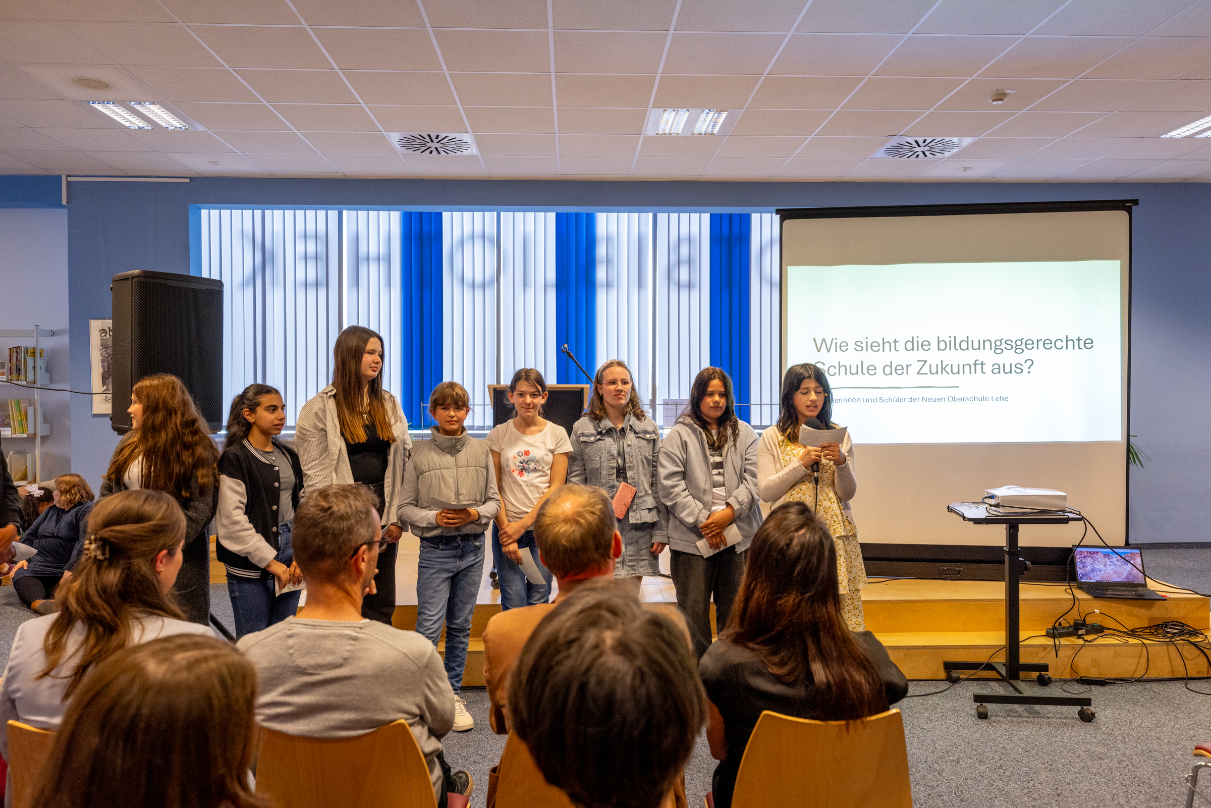 Schüler:innen der Neuen Oberschule Lehe stellten bei der Eröffnung ihre KI-Bilder zu ihrer Traumschule und ihres Berufswunsches vor, die sie gemeinsam in Workshops mit Gesine Born entwickelt haben.